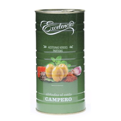 Aceitunas verdes con hueso aliñadas al estilo campero. Peso neto 1,400gr. Peso escurrido 700gr,