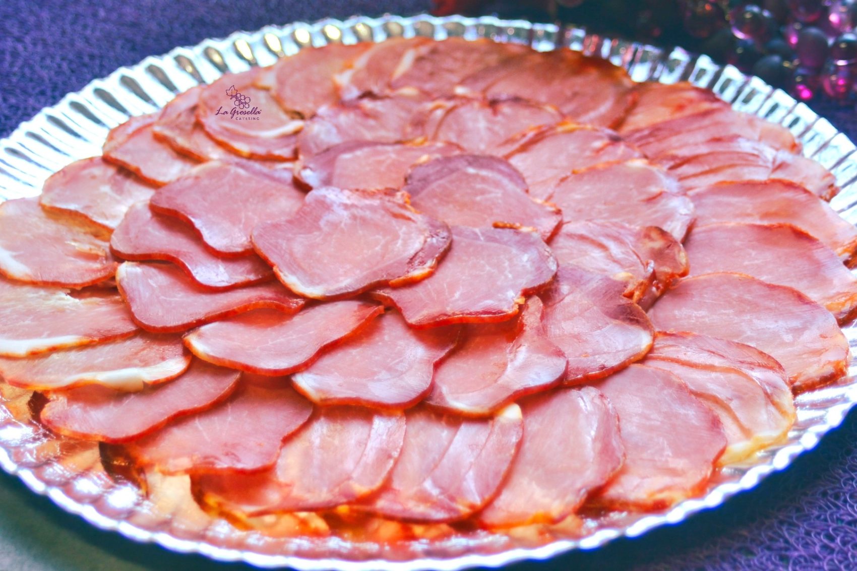 200gr. de surtido de lomo curado presentado y servido en bandeja con picos de pan.