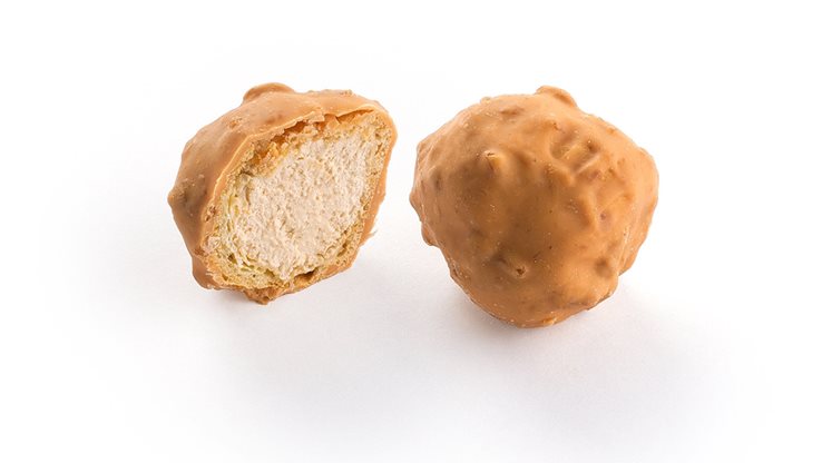 Profiterol relleno de mousse de caramelo y envueltas en una capa de cacao y caramelo crujiente, no podrás comer sólo uno!. Tus invitados no quedarán defraudados. 20gr.